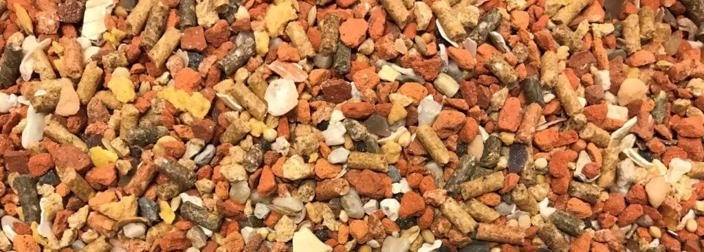 Roodsteen, silex, oesterschelpen, houtskool, opfokvoer, oregano, biscuit, kalk, pinda- en notenmix, witzaad, onkruidzaad, diverse mineralen en zaden, scherpe maagkiezel, mix van zeeschelpen, biergistkorrels, mineralenkruim, mineralenkorrels, soja-eiwitkorrels, lecithine.