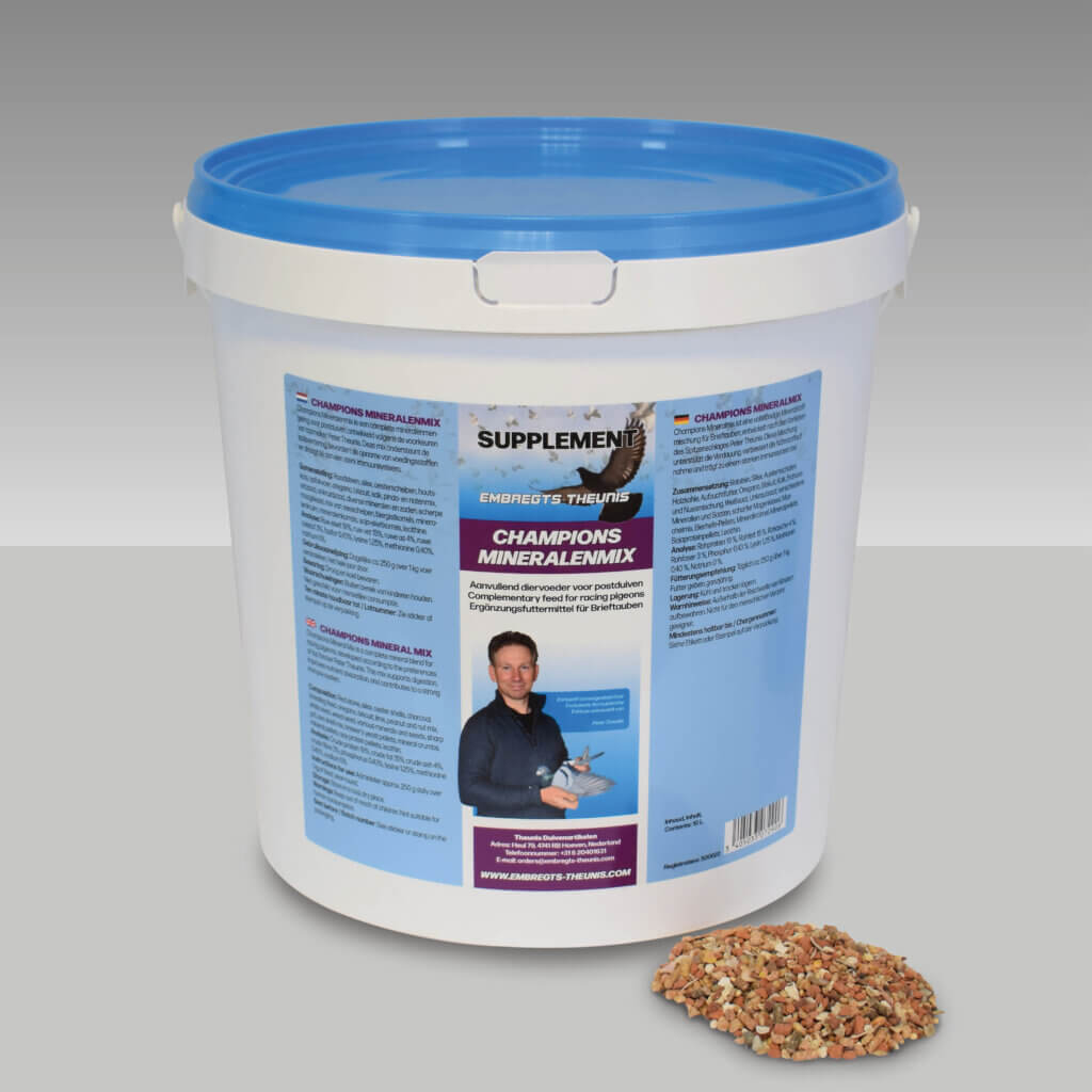 Champions Mineralenmix is een complete, hoogwaardige mineralenmengeling voor postduiven, samengesteld volgens de inzichten en voorkeuren van topmelker Peter Theunis.