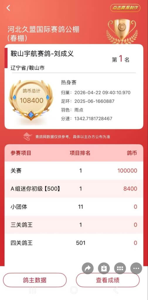 Vandaag kreeg ik een referentie van mijn Chinese vriend: een dochter van Millenniums Gold (de moeder van Pure Gold, die twee keer 1e Nationaal Asduif werd als jong) werd daar grootmoeder van een 1e Asduif in een grote eenhoksrace.